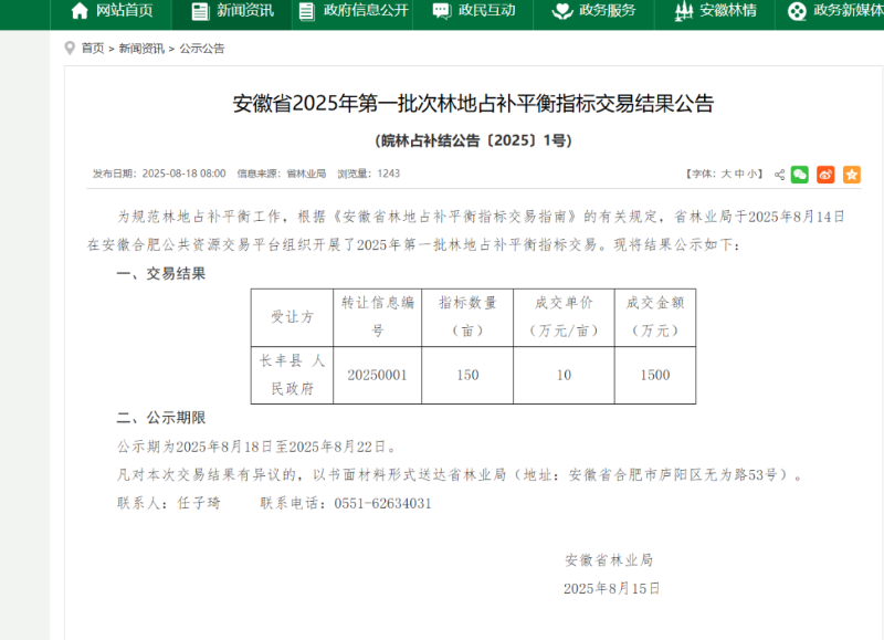 这次成功交易的林地占补平衡指标共150亩,全部来自祁门县的林地占补平衡储备库,总交易额1500万元。据了解,近年来,合肥市长丰县发展势头强劲,用林地缺口较大。根据《安徽省林地占补平衡实施方案》,建设项目占用林地实施“先补后占、以补定占”的林地占补平衡管理机制。在省、市相关部门的促成下,祁门和长丰两县达成占补平衡指标交易协议。