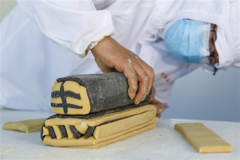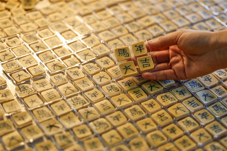 1月13日,祁门县非遗嵌字豆糖制作艺人经过熬糖、磨粉、搅拌、压实、制字、拉伸、切片等手工工序,在方寸糖块之中拼嵌出“馬年大吉”等吉祥字样,为马年新春增添浓浓的传统年味。