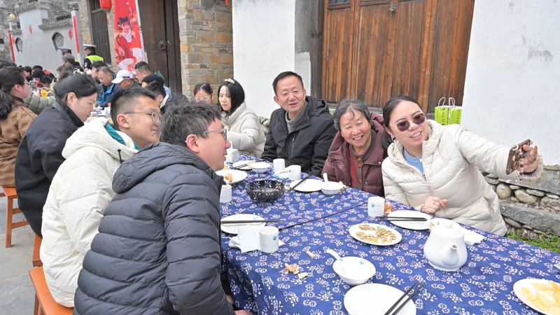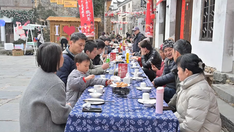 正月里,在闪里镇文堂村,一场传承多年的长桌宴热闹开席。村民与游客围坐古巷,共享徽州特色美食,共话团圆情谊,让千年古村的年味愈发醇厚。