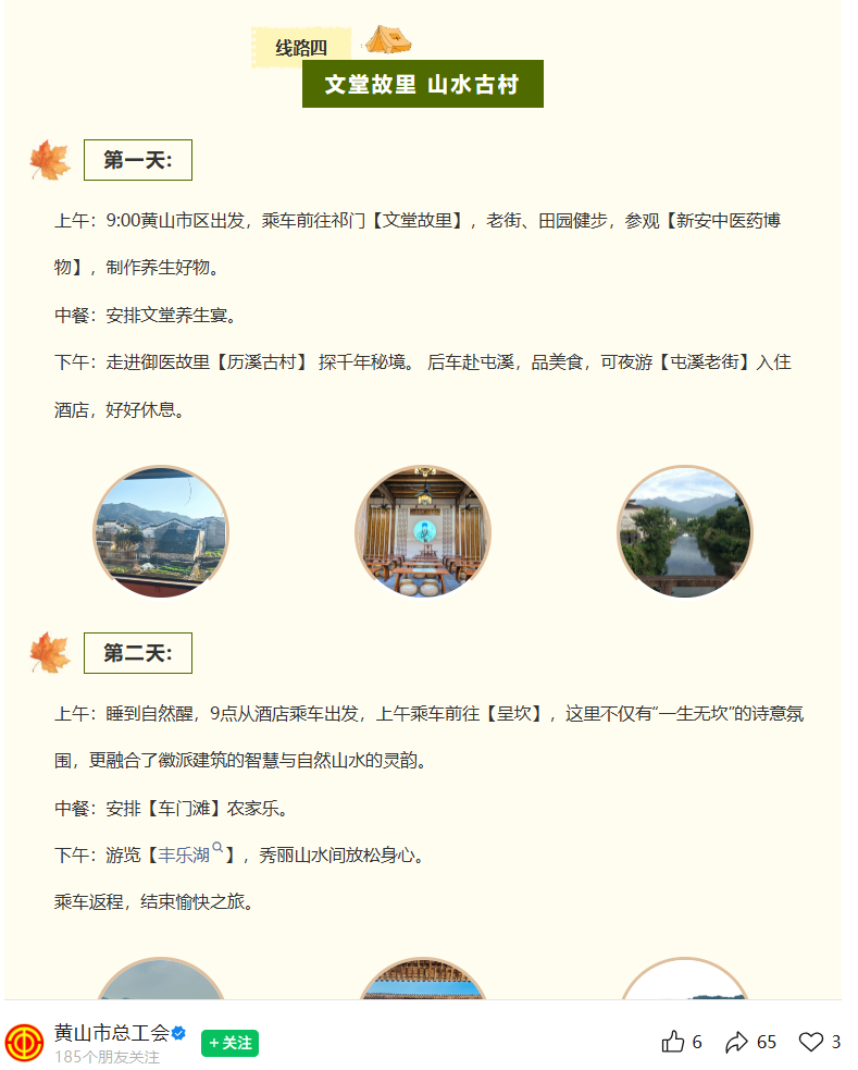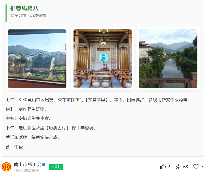 日前,黄山市总工会近期精心推出了春秋游一日游与二日游精品线路。祁门县的“文堂故里省级职工疗休养基地”与“历溪古村”收纳其中,为职工提供了融合自然山水、徽州古韵与中医康养的特色休养体验。