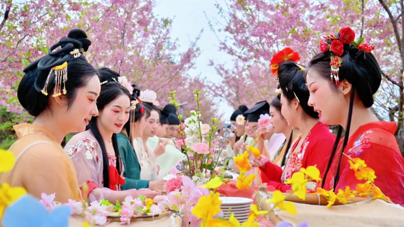 在文人诗会、击鼓传花等趣味互动环节中,游客们踊跃参与、对诗应答,感受传统文化的深厚底蕴。活动现场还精心准备了春日宴,菜品均采用春天时令食材,让大家在赏春游玩之余,品尝到清新鲜美的春日滋味。