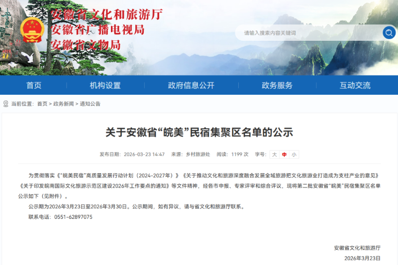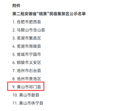 近日,安徽省文化和旅游厅发布第二批安徽省“皖美”民宿集聚区公示名单,经各市申报、专家评审和综合评议,黄山市祁门县成功上榜!这一荣誉是对我县民宿产业高质量发展成果的高度认可,更是我县深耕文旅融合、助力乡村振兴的重要里程碑,标志着祁门民宿发展迈入品牌化、特色化新征程。