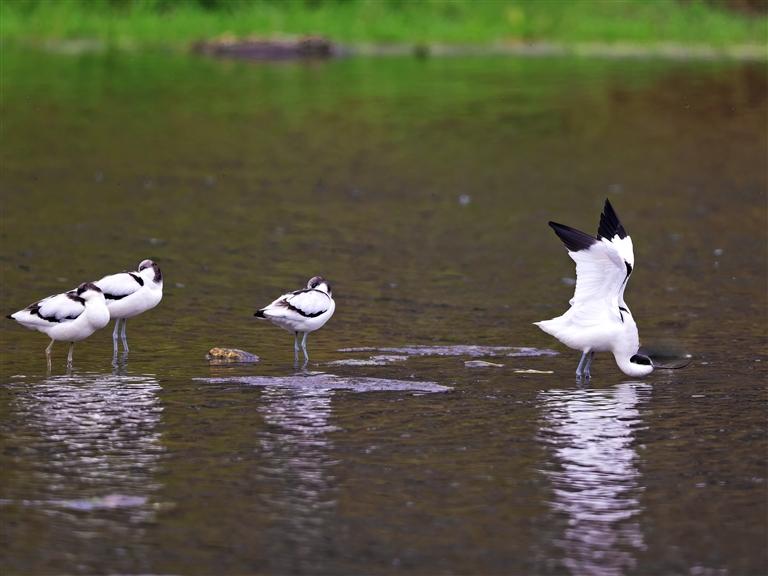 据了解,反嘴鹬因其独特的上翘嘴型而得名,属于国家三有保护动物。它羽毛黑白分明,宛如精心剪裁的燕尾服,因而被誉为“黑白精灵”。其喙弯如镰刀,在捕食时,左右扫动,如同一个小巧灵活的扫帚,可精准捕捉小甲壳类及昆虫幼虫,因而又被称为“水中扫荡者”。